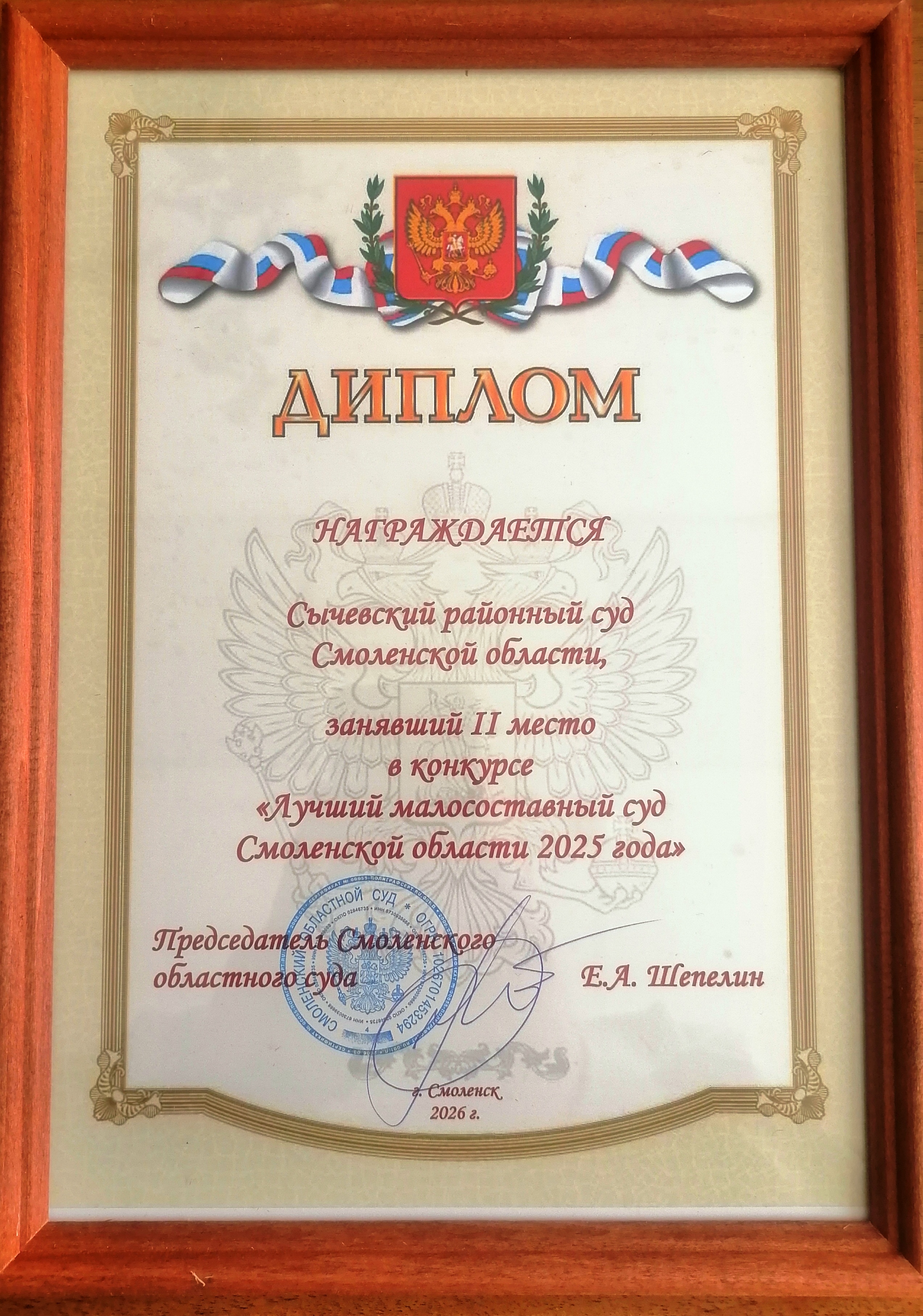 По итогам работы в 2025 году Сычёвский районный суд Смоленской области признан одним из лучших в регионе. Конкурсная комиссия, оценивая основные показатели деятельности, присудила нам почётное второе место в категории малосоставных судов. На расширенном совещании в Смоленском областном суде 13 марта 2026 года в ходе подведения итогов работы судов области за 2025 год, состоялась торжественная церемония награждения председателей судов, показавших высокие результаты работы. Высокая оценка конкурсной комиссии — это результат слаженной работы, профессионализма и ответственности всего коллектива. Решение принималось на основе тщательного анализа ключевых показателей деятельности судов региона. Наш коллектив занял II место в престижном конкурсе «Лучший малосоставный суд Смоленской области 2025 года». Председатель Смоленского областного суда Евгений Александрович Шепелин вручил памятный диплом председателю Сычёвского районного суда Елене Ивановне Вовенко. ![]() ![]() Эта награда — признание заслуг всего коллектива. Каждый из вас ежедневно вносит вклад в общее дело, и эта победа стала возможной благодаря вашему профессионализму и ответственности. В этот же день председатель Совета судей Смоленской области Антон Сергеевич Киселёв отметил заслуги Елены Ивановны Вовенко отдельной благодарностью — за большой вклад в развитие правосудия и судебной системы, защиту интересов судейского сообщества, обеспечение прав и свобод граждан и добросовестное исполнение должностных обязанностей.![]() ![]() |